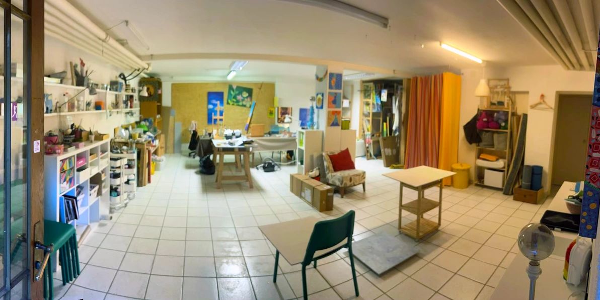 L'atelier où j'officie est un espace confortable et modulable pouvant accueillir jusqu'à 10 adultes ou 12 enfants pour des cours de dessin et peinture.